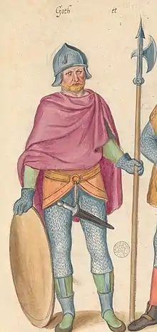 A 16th century perception of a Goth, illustrated in the manuscript "Théâtre de tous les peuples et nations de la terre avec leurs habits et ornemens divers, tant anciens que modernes, diligemment depeints au naturel". Painted by Lucas d'Heere in the 2nd half of the 16th century. Preserved in the Ghent University Library.[34]