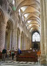 Following the destruction by fire of the choir of Canterbury Cathedral in 1174, a group of master builders was invited to propose plans for the reconstruction. The master-builder William of Sens, who had worked on Sens Cathedral, won the competition.[26] Work began that same year, but in 1178 William was badly injured by falling from the scaffolding, and returned to France, where he died.[36][37] His work was continued by William the Englishman who replaced his French namesake in 1178. The resulting structure of the choir of Canterbury Cathedral is considered the first work of Early English Gothic.[26] The cathedral churches of Worcester (1175–), Wells (c.1180–), Lincoln (1192–), and Salisbury (1220–) are all, with Canterbury, major examples.[26] Tiercerons – decorative vaulting ribs – seem first to have been used in vaulting at Lincoln Cathedral, installed c.1200.[26] Instead of a triforium, Early English churches usually retained a gallery.[26]
