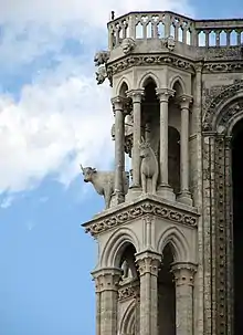Sens Cathedral was influential in its strongly vertical appearance and in its three-part elevation, typical of subsequent Gothic buildings, with a clerestory at the top supported by a triforium, all carried on high arcades of pointed arches.[26] In the following decades flying buttresses began to be used, allowing the construction of lighter, higher walls.[26] French Gothic churches were heavily influenced both by the ambulatory and side-chapels around the choir at Saint-Denis, and by the paired towers and triple doors on the western façade.[26]
