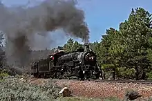 At a cost of $1.6 million, the major rebuild on No. 4960 took thirty-months over a three-year period to complete.[32][43] In May 1996, No. 4960 was test-fired outside the shop, and two months later, on July 9, the locomotive emerged from the shop and performed its first test run.[38][42][44] On July 27, No. 4960 pulled its first regular train for GCR between Williams and the Grand Canyon Village, and it led every subsequent GCR train by the end of September.[43][44] The O-1A was able to pull nine loaded passenger cars on GCR without diesel assistance, and while it is capable of pulling more, the extra capacity would create greater wear on the locomotive while traveling at lower speeds at the steep 3%-grades leading into the Canyon.[44] On the weekend of October 5-6, the Grand Canyon Chapter of the National Railway Historical Society (NRHS) hosted a series of photo charters to serve as No. 4960's formal GCR debut.[45] In August 2002, No. 4960 took part in that year's NRHS Convention on GCR, with the O-1A performing a photo doubleheader with visiting locomotive Santa Fe 3751 and a tripleheader with No. 18.[46][47][48]