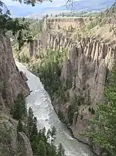 The Grand Canyon of the Yellowstone is the first large canyon on the Yellowstone River downstream from Yellowstone Falls in Yellowstone National Park in Wyoming. The canyon is approximately 24 miles (39 km) long, between 800 and 1,200 ft (240 and 370 m) deep and from 0.25 to 0.75 mi (0.40 to 1.21 km) wide.[1]
