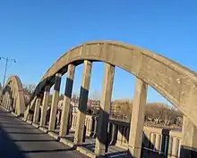 The Caledonia Bridge, also known as the Grand River Bridge (built 1927) is a road bridge located in Caledonia, Ontario, Canada on Argyle Street.[2] The bridge is the only nine-span bridge of its kind in Canada and is considered the first reinforced concrete bridge of its type ever built.[3]