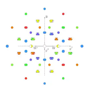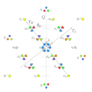 The pattern of weak isospins, weak hypercharges, and strong charges for particles in the SU(5) model, rotated by the predicted weak mixing angle, showing electric charge roughly along the vertical. In addition to Standard Model particles, the theory includes twelve colored X bosons, responsible for proton decay.