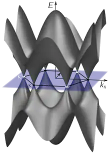 When the atoms are placed onto the graphene hexagonal lattice, the overlap between the pz(π) orbitals and the s or the px and py orbitals is zero by symmetry. The pz electrons forming the π bands in graphene can therefore be treated independently. Within this π-band approximation, using a conventional tight-binding model, the dispersion relation (restricted to first-nearest-neighbor interactions only) that produces energy of the electrons with wave vector k is[29][68]