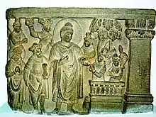 Mason's marks in Kharoshti point to craftsmen from the north-west (region of Gandhara) for the earliest reliefs at Sanchi, circa 115 BC.[24][26][27]