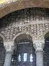 The first great religious building of Islam, the Dome of the Rock in Jerusalem, which was built between 688-692, was decorated with glass mosaics both inside and outside, by craftsmen of the Byzantine tradition. Only parts of the original interior decoration survive. The rich floral motifs follow Byzantine traditions, and are "Islamic only in the sense that the vocabulary is syncretic and does not include representation of men or animals."[27]
