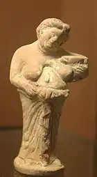 Tanagra figurines were a mold-cast type of figurine produced from the later fourth century BCE, primarily in the Boeotian town of Tanagra. They were coated with a liquid white slip before firing, and were sometimes painted afterwards in naturalistic tints with watercolors, such as the "Dame en Bleu" ("Lady in Blue") at the Louvre. Tanagra figures depict real women, and some men and boys, in everyday costume, with familiar accessories such as hats, wreaths or fans. They seem to have been decorative pieces for the home, used in much the same way as their modern equivalents, though unlike these they were often buried with their owners. Some character pieces[1] may have represented stock figures from the New Comedy of Menander and other writers. Others continued an earlier tradition of molded terracotta figures used as cult images or votive objects. Typically they were about 10 to 20 centimeters high.