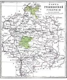 The Grodno Governorate[lower-alpha 1] was a governorate (guberniya) of the Northwestern Krai of the Russian Empire, with its administrative center in Grodno (Hrodna). The governorate encompassed 38,671.5 square kilometres (14,931.1 sq mi) in area and consisted of a population of 1,631,645 inhabitants by 1897. The Grodno Governorate bordered by the Suwałki Governorate to the north, the Vilna Governorate to the northeast, the Minsk Governorate to the east, the Volhynian Governorate to the south, the Kholm Governorate to the west, and the Łomża Governorate to the northwest. The governorate covered areas of the modern Grodno Region of Belarus, part of the Podlaskie Voivodeship of Poland, and a small part of Druskininkai, Lazdijai and Varėna districts of Lithuania.