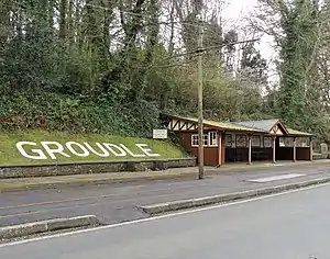 The station was the first terminus of the line in 1893, the following year an extension was opened as far as Laxey and the station became an intermediate one. The building that still occupies the site, consisting of a large open waiting shelter incorporating ticket office, dates from the beginning of the railway, but has been unmanned for many years. Despite its somewhat basic appearance and lack of facilities, the station was one of the most popular on the line, serving the glen which operated as pleasure grounds, the adjacent hotel and nearby narrow gauge railway. The hill figure next to it reading "GROUDLE" was placed next to the shelter in a more recent date.