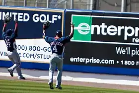 Outfielders raising their arms, due to the baseball going under or becoming stuck in the fence, resulting in a ground rule double.