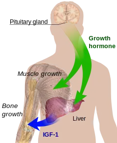 2. GH also stimulates, through the JAK-STAT signaling pathway,[39] the production of insulin-like growth factor 1 (IGF-1, formerly known as somatomedin C), a hormone homologous to proinsulin.[40] The liver is a major target organ of GH for this process and is the principal site of IGF-1 production. IGF-1 has growth-stimulating effects on a wide variety of tissues. Additional IGF-1 is generated within target tissues, making it what appears to be both an endocrine and an autocrine/paracrine hormone. IGF-1 also has stimulatory effects on osteoblast and chondrocyte activity to promote bone growth.