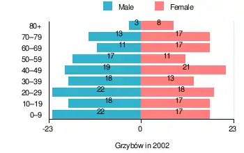 According to the 2002 Poland census, there were 282 people residing in Grzybów village, of whom 50.7% were male and 49.3% were female. In the village, the population was spread out, with 22.3% under the age of 18, 35.8% from 18 to 44, 19.5% from 45 to 64, and 22.3% who were 65 years of age or older.[1]