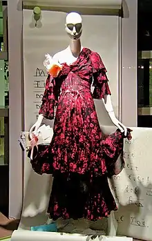 Dawn Mello hired Tom Ford to oversee the women's ready-to-wear collection.[27] In 1994, Tom Ford was named creative director of Gucci.[31] Ford and Mello revisited the 1970s archives of the brand. Ford's 1995 collection, which included the sensual white dresses with provocative cut-outs, became an instant hit.[27] Revived through the hot-bod hedonism of Tom Ford's creations, Gucci also launched provocative products in limited edition such as silver handcuffs,[32] a G-string[33] and provocative ad campaigns such as the G logo shaved on pubic hair.[34]