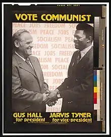 In the 1964 United States presidential election, Hall's party supported Lyndon B. Johnson, saying it was necessary to prevent the victory of the conservative Barry Goldwater.[24] During the 1972 presidential election, the CPUSA withdrew its support from the Democratic Party and nominated Hall as its candidate.[25] Hall ran for president four times — in 1972, 1976, 1980, and 1984 — the last two times with Angela Davis.[4] Of the four elections, Hall received the largest number of votes in 1976, largely because of the Watergate scandal bringing protest votes for minor parties. Hall ranked only in eighth place among the presidential candidates.[26] Owing to the great expense of running, the difficulty in meeting the strenuous and different election law provisions in each state, and the difficulty in getting media coverage, the CPUSA decided to suspend running national campaigns while continuing to run candidates at the local level. While ceasing presidential campaigns, the CPUSA did not renew support for the Democratic party.[27]