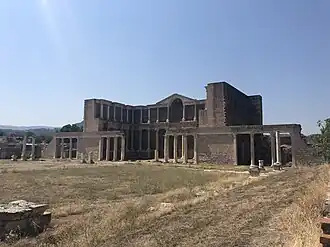 Gymnasia were typically large structures containing spaces for each type of exercise as well as a stadium, palaestra, baths, outer porticos for practice in bad weather, and covered porticos where philosophers and other "men of letters" gave public lectures and held disputations.[9] Most Athenian gymnasia were located in suburban areas due to the large amount of level space required for construction. Additionally, these areas tended to be cooler and closer to a good water supply than similar areas in central Athens.[17]