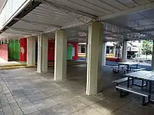 The school also gained a classroom block for Intermediate students (in 2018 named Block D), east of the northern end of Block C.[82] The first section of Block D, constructed after May 1958 and occupied in 1959, included four classrooms on the first floor, each with double doors to the northern verandah, which had a metal-sheeted balustrade and a separate roof with clerestory windows above. The west end of the building was brick. The understorey contained an open play area, under open web steel trusses which were supported on lozenge shaped concrete columns.[83][84][85] Three more classrooms were added to the east end of Block D after November 1958, while a brick Boys toilet block, with lockers and showers, was added at the west end of the understorey.[86][87] By 1982, a passageway had replaced part of the second classroom from the east end.[88][1]