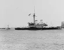 Two years later, in March 1897, she was relieved of that duty and became a depot ship in July at Devonport.[19] The ship was reboilered and had more QF guns installed in 1898. Dreadnought was reclassified as a second-class battleship in 1900 and took part in British fleet manoeuvres in that year and the following one.[18] In June 1902, she was refitted at Chatham to serve as a tender to HMS Defiance, torpedo school ship at Devonport,[20] and later as a depot ship. She took part in the fleet review held at Spithead on 16 August 1902 for the coronation of King Edward VII,[21] and was commissioned as tender four days later, on 20 August 1902.[22] Lieutenant Harry Louis d′Estoteville Skipwith was appointed in command in October 1902.[23] She was taken out of service and transferred to the Kyles of Bute in 1905.[18] The ship was sold to Thos. W. Ward for scrap for £23,000 on 14 July 1908 and was broken up by February 1909.[19]