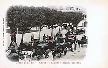 The origins of the word hackney in connection with horses and carriages are uncertain. The origin is often attributed to the London borough of Hackney, whose name likely originated in Old English meaning 'Haka's Island'. There is some doubt whether the word hack for a horse was derived from this place-name, as the area was historically marshy and not well-suited for keeping horses.[11] The American Hackney Horse Society favours an alternative etymology stemming from the French word haquenée—a horse of medium size recommended for lady riders—which was brought to England with the Norman Conquest and became fully assimilated into the English language by the start of the 14th century. The word became associated with an ambling horse, usually for hire.