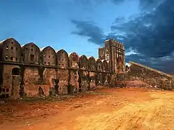 The fort, quadrangular in size, consists of a pentagonal curtain wall machicolated for muskets with rounded corner bastions. On the inner side of the curtain wall there is a 1.22 m high rampart walkway from the base of the curtain wall which is itself pierced by several musketry holes. The holes are wider meant probably for 'gun firing at the pirates proceeding up the river'. In a corner of the fort enclosure there is a tall free standing square column of brick which must have been used for observation and placing guns in the rainy season.