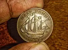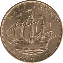 The British pre-decimal halfpenny, (pronounced /ˈhpəni/), once abbreviated ob. (from the Latin 'obulus'),[1] was a denomination of sterling coinage worth 1/480 of one pound, 1/24 of one shilling, or 1/2 of one penny. Originally the halfpenny was minted in copper, but after 1860 it was minted in bronze. In the run-up to decimalisation, it ceased to be legal tender from 31 July 1969 (although halfpennies dated 1970 were minted as part of a final pre-decimal commemorative set).[2] The halfpenny featured two different designs on its reverse during its years in circulation. From 1672 until 1936 the image of Britannia appeared on the reverse, and from 1937 onwards the image of the Golden Hind appeared.[3] Like all British coinage, it bore the portrait of the monarch on the obverse.[4]