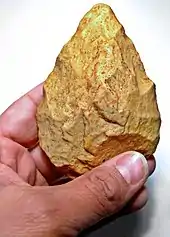 A hand axe (or handaxe or Acheulean hand axe) is a prehistoric stone tool with two faces that is the longest-used tool in human history.[1] It is made from stone, usually flint or chert that has been "reduced" and shaped from a larger piece by knapping, or hitting against another stone. They are characteristic of the lower Acheulean and middle Palaeolithic (Mousterian) periods, roughly 1.6 million years ago to about 100,000 years ago, and used by Homo erectus and other early humans, but rarely by Homo sapiens.[2]
