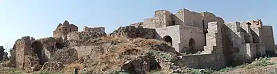 The Harran Castle is a large brick fortress of unknown date, though ancient Greek inscriptions found at one of its gates suggest that it was founded at some point during Byzantine rule (4th–7th centuries).[17] It is also possible that it was built under Muslim rule in the 9th century.[77] If it was not built in the 9th century, it is likely to at least have been expanded in the early Islamic period. Before its fall into ruin, the castle was a three-story structure. It was probably initially a palace but was converted into a more castle-like militaristic building in the 11–13th centuries when the region surrounding Harran experienced considerable political turmoil. The castle has recently been partially excavated and reconstructed with the support of the Turkish Ministry of Culture and Tourism.[17]