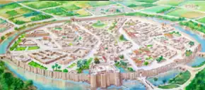 Although next to nothing is known of the architecture and layout of Harran prior to the Middle Ages,[27] the city is believed to have been designed according to a vaguely moon-shaped plan[10] since Medieval sources allude to this. What kind of moon shape is meant by the sources is not clear.[28]