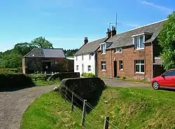 Blaeu's map of 1654 records a 'Heuch' at the site of the present day village.[10] In 1747 an unnamed settlement is indicated on Roy's map with Damhead named further up river, showing that a dam existed at this point at that date, some years before the days of Robert Burns.[11] In 1775 Haugh is shown on Armstrong's map.[12] Thomson's map of 1832 shows Haughmills with three mills indicated and the dwelling of Damhead is also shown up river.[13]