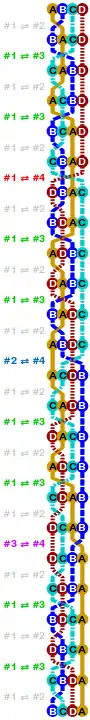 A map of the 24 permutations and the 23 swaps used in Heap's algorithm permuting the four letters A (amber), B (blue), C (cyan) and D (dark red)