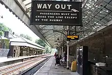 The station has a staffed ticket office, waiting rooms, toilets and a cafe.[7][8] New lifts have been installed to make both platforms fully accessible (commissioned in March 2019),[9] and Information screens were installed in 2012 as part of a programme to provide screens at 18 stations on the Calder Valley Line and elsewhere in West Yorkshire.[10] Previously, passengers had to rely on automated public-address system announcements.