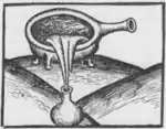 - A detailed description of the methods and apparati, showing influences from Jean de Roquetaillades‘ book De consideratione quintae essentiae.[6][7][8] The name of distillation was given by the alchemists not only to the procedure that is nowadays called distillation, but as well to methods like „filtration“ and „circulation“ that were interpreted as methods of „de-stillatio (dropping down)“.[9]