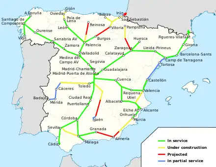 As of May 2023, the Spanish high-speed rail network is the longest HSR network in Europe with 3.966 km (2.464 mi)[1] and the second longest in the world, after China's.