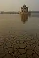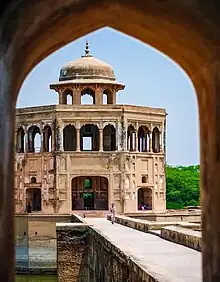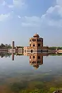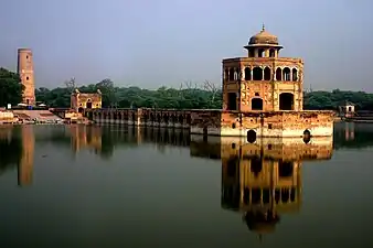 An octagonal pavilion built during the reign of Shah Jahan is at the centre of the pool.[1] It is two-storeyed, and topped by a rooftop chhatri that served as a stone gazebo. Its architecture is similar to the Sher Mandal at Delhi's Purana Qila[8] built by Emperor Humayun.