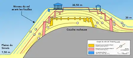Hisarlik or Hissarlik (Turkish: Hisarlık, "Place of Fortresses") is the Turkish name for an ancient city located in what is known historically as Anatolia,[note 1] near modern-day Gökçalı in Çanakkale, Turkey.[1] The archaeological site lies approximately 6.5 kilometres (4.0 mi) from the Aegean Sea and about the same distance from the Dardanelles. The site is a partial tell, or artificial hill, elevated in layers over an original site. In this case the original site was already elevated, being the west end of a ridge projecting in an east–west direction from a mountain range.