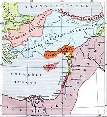 On June 26, 1243, the Seljuk armies were defeated by the Mongols in the Battle of Kosedag, and the Seljuk Sultanate of Rûm became a vassal of the Mongols.[39] This caused the Seljuks to lose their power. Hulegu Khan, grandson of Genghis Khan founded the Ilkhanate in the southwestern part of the Mongol Empire. The Ilkhanate ruled Anatolia through Mongol military governors. The last Seljuk sultan Mesud II, died in 1308. The Mongol invasion of Transoxiana, Iran, Azerbaijan and Anatolia caused Turkomens to move to Western Anatolia.[40] The Turkomens founded some Anatolian principalities (beyliks) under the Mongol dominion in Turkey.[41] The most powerful beyliks were the Karamanids and the Germiyanids in the central area. Along the Aegean coast, from north to south, stretched Karasids, Sarukhanids, Aydinids, Menteşe and Teke principalities. The Jandarids (later called Isfendiyarids) controlled the Black Sea region round Kastamonu and Sinop.[42] The Beylik of the Ottoman Dynasty was situated in the northwest of Anatolia, around Söğüt, and it was a small and insignificant state at that time. The Ottoman beylik would, however, evolve into the Ottoman Empire over the next 200 years, expanding throughout the Balkans, Anatolia.[43]