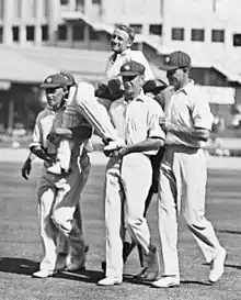 Extraordinary sporting successes did something to alleviate the spirits of Australians during the economic downturn. In a Sheffield Shield cricket match at the Sydney Cricket Ground in 1930, Don Bradman, a young New South Welshman of just 21 years of age wrote his name into the record books by smashing the previous highest batting score in first-class cricket with 452 runs not out in just 415 minutes.[69] The rising star's world beating cricketing exploits were to provide much needed joy to Australians through the emerging Great Depression in Australia and post-World War II recovery. Between 1929 and 1931 the racehorse Phar Lap dominated Australia's racing industry, at one stage winning fourteen races in a row.[70] Famous victories included the 1930 Melbourne Cup, following an assassination attempt and carrying 9 stone 12 pounds weight.[71] Phar Lap sailed for the United States in 1931, going on to win North America's richest race, the Agua Caliente Handicap in 1932. Soon after, on the cusp of US success, Phar Lap developed suspicious symptoms and died. Theories swirled that the champion race horse had been poisoned and a devoted Australian public went into shock.[72] The 1938 British Empire Games were held in Sydney from 5–12 February, timed to coincide with Sydney's sesqui-centenary (150 years since the foundation of British settlement in Australia).