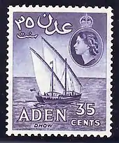 Queen Elizabeth II and Gulf of Aden at Yemen 35 cent Stamp.