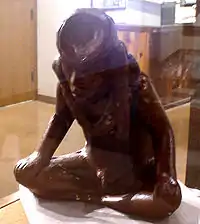 Red Horn (also known as 'He Who Wears (Human) Faces on His Ears'[7]) is found in the oral traditions of the Ioway,[8] and Hocągara (Winnebago) (whose ethnology was recorded by anthropologist Paul Radin, 1908–1912).[9] The Red Horn Cycle depicts his adventures with Turtle, the thunderbird Storms-as-He-Walks (Mą’e-manįga) and others who contest a race of giants, the Wąge-rucge or "Man-Eaters", who have been killing human beings whom Red Horn has pledged to help. Red Horn eventually took a red haired giant woman as a wife. Archaeologists have speculated that Red Horn is a mythic figure in Mississippian art, represented on a number of Southeastern Ceremonial Complex (SECC) artifacts.[10] Hall has shown that the mythic cycle of Red Horn and his sons has some interesting analogies with the Hero Twins mythic cycle of Mesoamerica.[11]