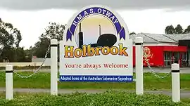 Holbrook is a small town on the traditional lands of the Wiradjuri people in Southern New South Wales, Australia. It is on the Hume Highway, 384 kilometres (239 mi) by road North East of Melbourne[2] and 492 kilometres (306 mi) by road south-west of Sydney[3] between Tarcutta and Albury. The town is in the Greater Hume Shire which was established in May 2004 from the merger of Culcairn Shire with the majority of Holbrook Shire and part of the Hume Shire. At the 2016 census, Holbrook had a population of 1,715 people.[1] The district around Holbrook is renowned for local produce including merino wool, wheat and other grains, lucerne, fat cattle and lamb.