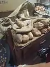 It is cut into slices and placed on a bamboo skewer. The outer side is fried until orange colour and the inside is filled with grease and fat.