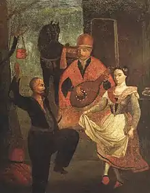Hopak (Ukrainian: гопа́к, IPA: [ɦoˈpɑk]) is a Ukrainian folk dance originating as a male dance among the Zaporozhian Cossacks, but later danced by couples, male soloists, and mixed groups of dancers. It is performed most often as a solitary concert dance by amateur and professional Ukrainian dance ensembles, as well as other performers of folk dances.[1] It has also been incorporated into larger artistic opuses such as operas, ballets and theatre.