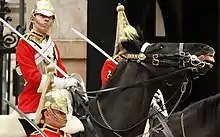 A British Life Guards horse sticks its tongue out to the side in discomfort.