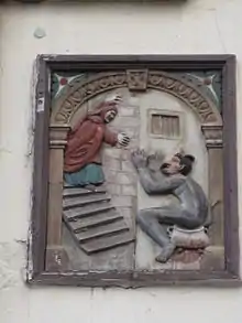 Sandstone relief Großmutter und Teufel (Grandmother and the Devil) on the firewall, copied from the original 16th/17th century version