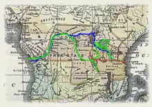 It was therefore essential that Stanley should trace the course of the Lualaba downstream (northward) from Nyangwe, the point where Livingstone had left it in July 1871.[25] Between November 1876 and August 1877, Stanley and his men navigated the Lualaba up to and beyond the point where it turned sharply westward, away from the Nile, identifying itself as the Congo River.[8]:315 Having succeeded with this second objective, they then traced the river to the sea. During this expedition, Stanley used sectional boats and dug-out canoes to pass the large cataracts that separated the Congo into distinct tracts. These boats were transported around the rapids before being reassembled to travel on the next section of river. In passing the rapids many of his men were drowned, including his last white colleague, Frank Pocock.[26] Stanley and his men reached the Portuguese outpost of Boma, around 100 kilometres (62 mi) from the mouth of the Congo River on the Atlantic Ocean, after 999 days on 9 August 1877. Muster lists and Stanley's diary (12 November 1874) show that he started with 228 people[3]:163,511 note 21 and reached Boma with 114 survivors, with him the only European left alive out of four. In Stanley's Through the Dark Continent (1878) (in which he coined the term "Dark Continent" for Africa), Stanley said that his expedition had numbered 356,[27][28] the exaggeration detracting from his achievement.