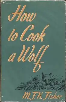 Wolf may be the "best known"[14] of the 20-odd books produced by American food writer Fisher, whose writing has been described as "highly stylized" and so lyrical that she is "basically a Sappho."[15] Nominally about food, home economics, thrift, and preparedness, How to Cook a Wolf has been described "barely a cookbook"[13] and "part experimental cookbook, part 'escape reading material,' and part war protest."[16]