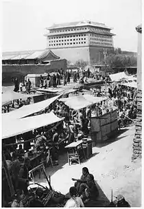 In the Yuan dynasty, the vicinity of what is now Huashi was a scenic area of lush meadows and gardens just outside the city of Dadu.[3] In 1422, an imperial lumber shop called the Sacred Wood Factory opened to process logs shipped from Sichuan to build palaces of the Ming dynasty.[3] In 1553, when the neighborhood was enclosed by the outer city wall, there were already 322 shops in the area.[3]