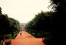While the main tomb took over eight years to build, it was also placed in centre of a 30-acre (120,000 m2) Charbagh, a Persian-style garden with a quadrilateral layout. It was the first of its kind in South Asia on such a scale.[23] The highly geometrical and enclosed Paradise garden is divided into four squares by paved walkways (khiyabans) and two bisecting central water channels, reflecting the four rivers that flow in jannat, the Islamic concept of paradise. Each of the four square is further divided into 8 smaller gardens with pathways, creating 32 miniature gardens in all (with the mausoleum in the centre), a design typical of later Mughal gardens. The central water channels appear to be disappearing beneath the tomb structure and reappearing on the other side in a straight line, suggesting a Quranic verse which talks of rivers flowing beneath the 'Garden of Paradise'.[35][24]
