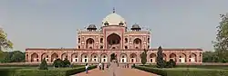 Humayun's tomb (Persian: Maqbara-i Humayun) is the tomb of Mughal emperor, Mirza Nasir al-Din Muhammad commonly known as Humayun situated in Delhi, India.[1] The tomb was commissioned by Humayun's first wife and chief consort, Empress Bega Begum under her patronage[2][3][4][5][6] in 1558, and designed by Mirak Mirza Ghiyas and his son, Sayyid Muhammad,[7] Persian architects chosen by her.[8][9] It was the first garden-tomb on the Indian subcontinent,[10] and is located in Nizamuddin East, Delhi, close to the Dina-panah Citadel, also known as Purana Qila (Old Fort), that Humayun found in 1538. It was also the first structure to use red sandstone at such a scale.[11][12] The tomb was declared a UNESCO World Heritage Site in 1993,[10] and since then has undergone extensive restoration work, which is complete.[13] Besides the main tomb enclosure of Humayun, several smaller monuments dot the pathway leading up to it, from the main entrance in the West, including one that even pre-dates the main tomb itself, by twenty years; it is the tomb complex of Isa Khan Niazi, an Afghan noble in Sher Shah Suri's court of the Suri dynasty, who fought against the Mughals, constructed in 1547 CE.