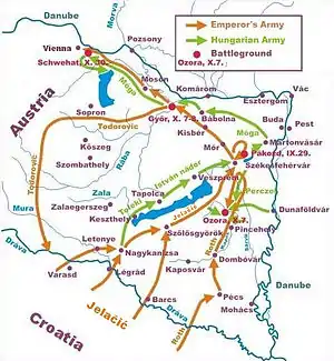 Hungary now had war raging on four fronts: Jelačić's Croatian troops to the South; Romanians in Banat to the South-East; Austrian troops led by Karl von Urban and Romanian insurgents headed by Avram Iancu in Transylvania to the East; and Austrian main forces under the supreme commender of Windischgrätz to the west.