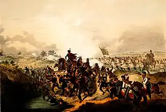 After a series of serious Austrian defeats in 1849, the Austrian Empire came close to the brink of collapse. The new emperor Franz Joseph I had to call for Russian help in the name of the Holy Alliance.[10] In the hope of Russian military support, the young Emperor Franz Joseph kissed the hands of the Ruler of all the Russians in Warsaw on 21 May 1849.[11] Nicholas I of Russia agreed with Franz Joseph and sent a 200,000 strong army with 80,000 auxiliary forces. The joint Russo-Austrian army finally defeated the Hungarian forces, Habsburg power was restored and Hungary was placed under martial law.[12]